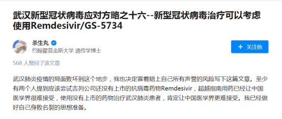 其实,早在1月24日,一名认证为“约翰霍普金斯大学遗传学博士”的网友在知乎上就表示,这次源自于武汉的新型肺炎可以尝试用吉利德的瑞德西韦来治疗。