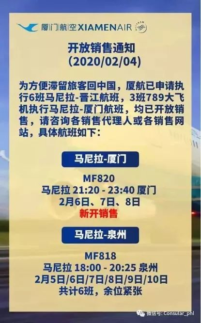 2月5日,厦航MF818航班从菲律宾马尼拉机场起飞,搭载了169名滞留菲律宾的华人回国,落地泉州机场。5日起,厦航将陆续调机前往马尼拉接滞留当地的同胞回家,预计总共执行9班加班航班,其中马尼拉-泉州6班,马尼拉-厦门3班。