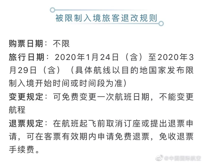 目前,国航、东航、吉祥航空、亚洲航空、大韩航空等国内外的部分航空公司已更新了机票退改规则,受出行政策影响而导致航班被取消的旅客,可以申请免费改签日期一次,或申请退票,免收手续费。