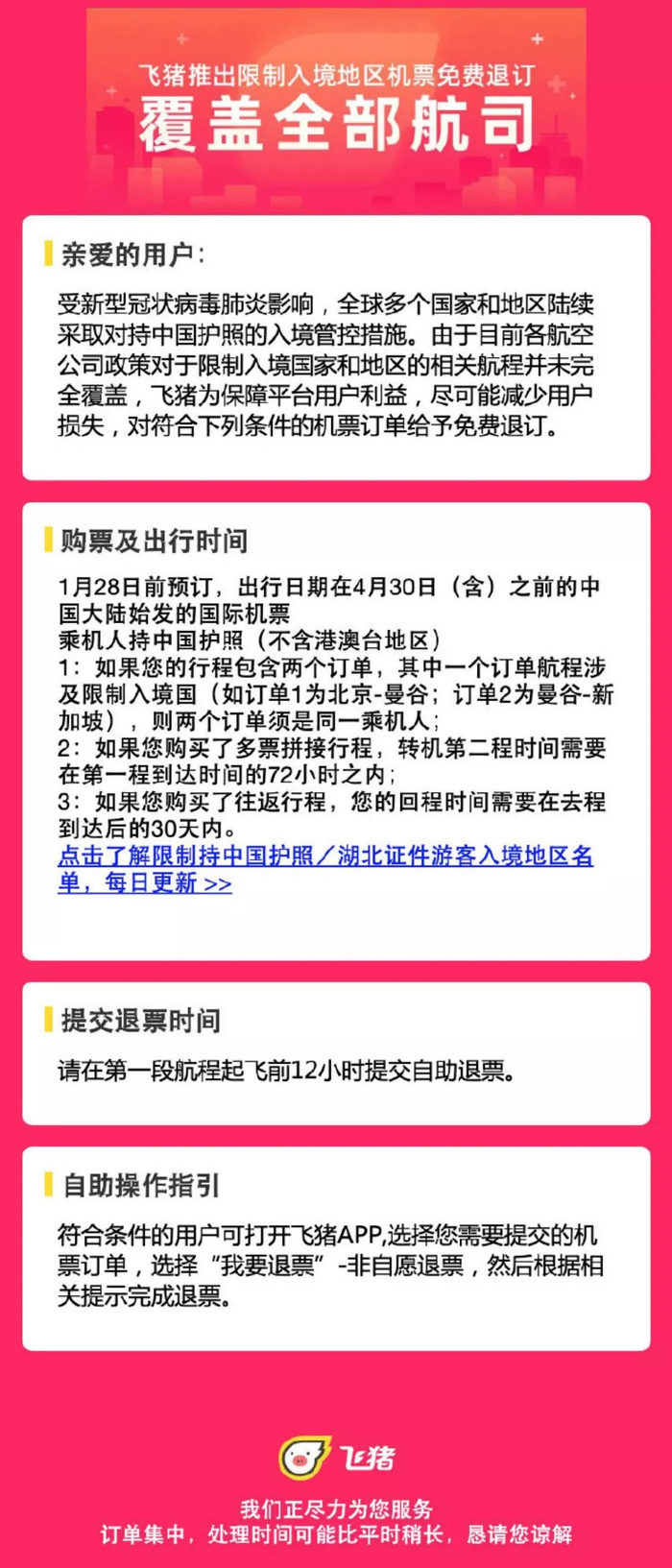 为帮助用户减少损失,OTA平台也在采取各种行动。2月7日下午,飞猪首家推出限制入境地区机票免费全退的通知,涉及对持中国护照或湖北证件限制入境地区的机票订单,不论航司政策是否覆盖,用户都可免费退订,出行时间最长可至4月底。