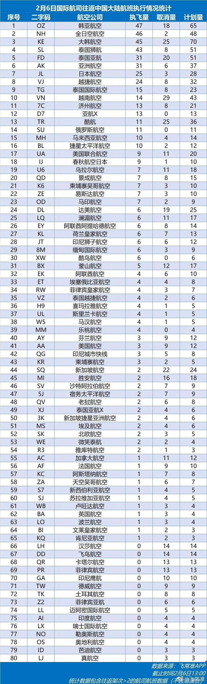 从国际航司执飞情况来看,2月以来,取消的航班数量也在日渐递增。飞常准数据显示,2月2日,共334架次往返中国航班取消;截至2月5日中午12:00,当日往返中国大陆航班中,67家国际航司共取消航班506架次;截至2月6日下午13:00,当日76家国际航司取消558架次。