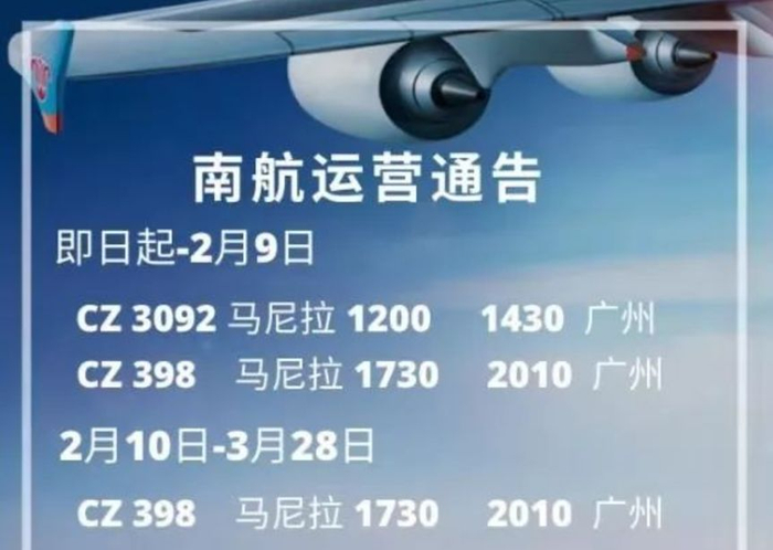 此外,南航即日起至2月9日每日有两趟航班执飞马尼拉至广州,2月10日至3月28日期间有一趟航班执飞马尼拉至广州。吉祥航空也协调了上海浦东-宿务的往返航班,航班时间为2月7日。