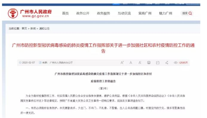 此外,广州也在7日宣布所有居住小区(村)实行封闭管理。广州市防控新型冠状病毒感染的肺炎疫情工作指挥部发布《关于进一步加强社区和农村疫情防控工作的通告》(第3号)。