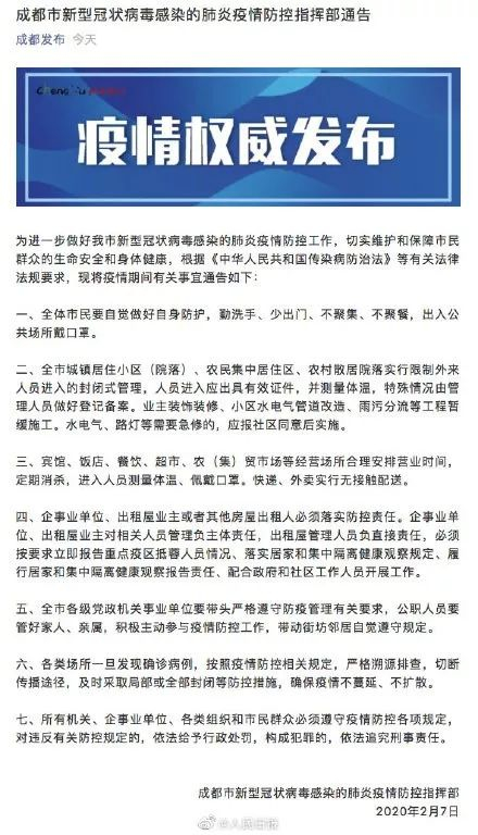 7日晚间,成都市新型冠状病毒感染的肺炎疫情防控指挥部发布通告,称全市城镇居住小区(院落)、农民集中居住区、农村散居院落实行限制外来人员进入的封闭式管理。