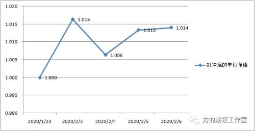 从节前的最后一个交易日(1月23日)到本周四(2月6日),如果把1月23日的净值标准化为1,那么这个套保组合在四天内的单位净值走势为1.000到1.016、到1.006、再到1.013、再到1.014。期间,上证50累计下跌2.84%,套保组合的净值反而上升了1.40%,尤其是周一的大幅跳空,上证50当日大跌7%,3000多只个股跌停,套保组合在当日的净值反而上涨了1.60%,当日的套保效果可谓非常的好,这一方面得益于原来轻度虚值认沽变成了深度实值认沽,delta维度的赚钱效应十分明显,另一方面也得益于尾盘最后半小时买沽的波动率快速上升,vega维度成为了辅助的收入来源。