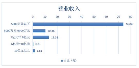 74.04%的企业2019年营业收入在5000万元以下,10.36%的企业营业收入在5000万元~9999万元,营收1亿元以下的企业合计占比84.4%;营业收入1亿元~5.9亿元的企业占13.38%。说明参与问卷调查的企业绝大多数是中小企业。