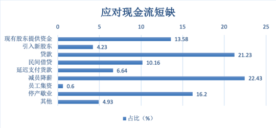 为渡过难关,22.43%的企业计划减员降薪,21.23%的企业准备贷款,16.20%的企业选择停产歇业,13.58%的企业股东自己增资,还有10.16%的企业选择民间借贷。当然,企业可能会同时采取多种途径渡过难关。