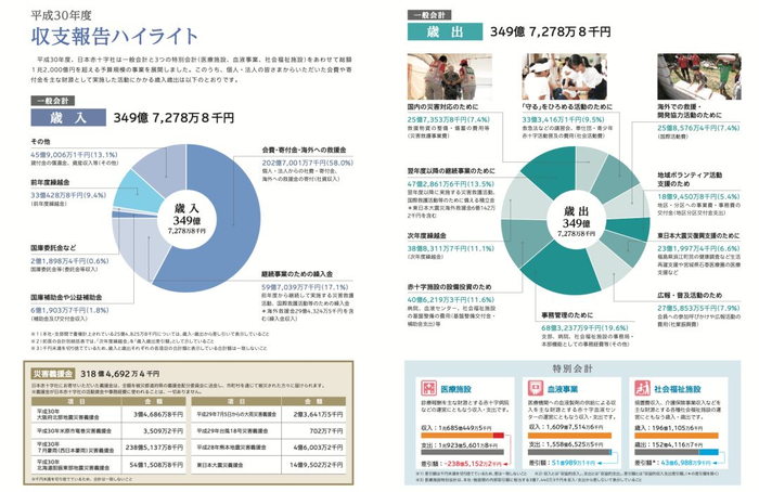 2018 年度,日本红十字会的“一般会计”收入总计约 349.7 亿日元(约合 22.4 亿元人民币),全部用于支持日本国内外各种灾害应对费用(包括活动与物资等),以及开展日本国内救援训练、志愿者活动与灾害复兴支援活动,日本红十字会日常运营管理费用也出自这笔收入。