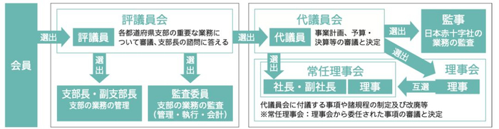 从 2017 年开始,日本红十字会将“社员”改称为“会员”(日语中,红十字会被称为“赤十字社”),每年捐款 2000 日元(约合 128 元人民币)以上的个人或法人均可成为红十字会会员。除了从事相关医疗事业和负责日常运营的雇员外,红十字会目前拥有 14.1 万名个人会员和 7.6 万名法人会员。非法人会员可享受参加干事与代议员选举、接受业务与收支报告的权利。会员还可通过代议员向红十字会提出建议。各都道府县会员选出的评议员代表会员选出 223 名代议员,组成红十字会最高决议机构,负责日程决议、预算与规程制定。同时,在总部与支部分别选出监事和监察委员,负责管理、执行与会计监督。