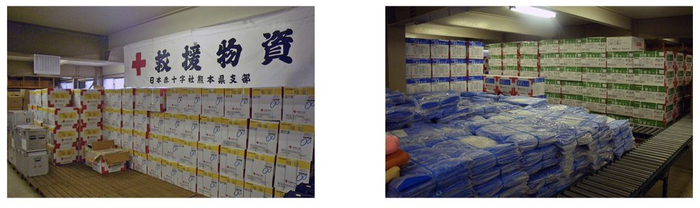 平时,日本红十字总部与各地支部会根据当地人口情况设定物资储备数量。灾害发生后,日本红十字会在政府部门协助下将物资运往受灾地,由志愿者团体协助将救援物资分发给有需要的民众。如果支部物资不足,可以向其他支部申请物资支援。