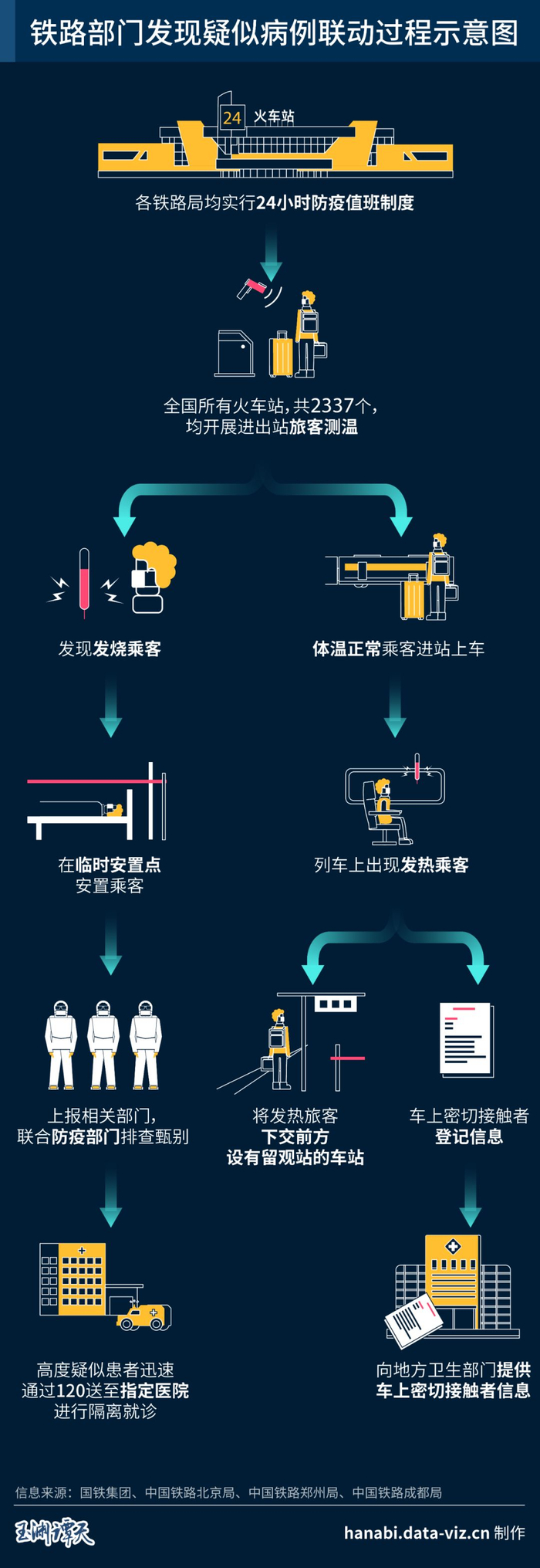 从进出站测温,到设置留观站与驻站医生,再到高度疑似患者及时送医就诊,同乘人员信息登记与跟踪排查……这样的防疫流程,需要铁路部门、卫健委、疾控中心等多方力量协同配合,环环相扣,一环也出不得差错。
