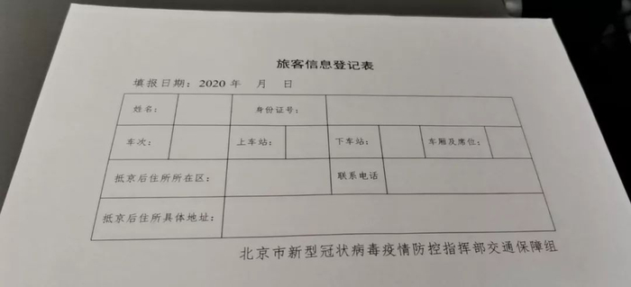 这是谭主在回京的高铁上收到的一张旅客信息登记表。到达北京后,这一张信息表由铁路部门统一收集、保存,便于追踪每一位乘车旅客的情况。