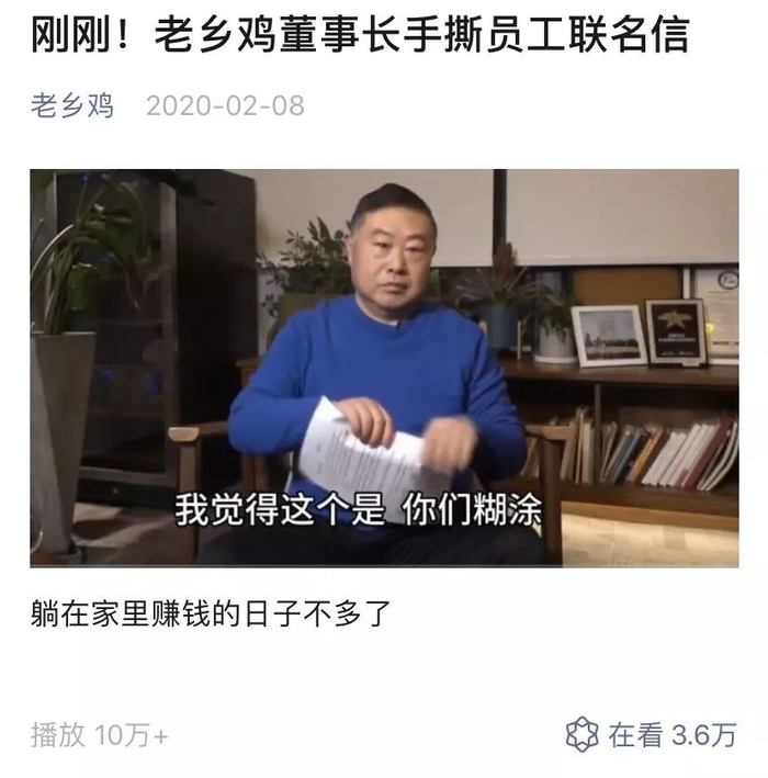 视频来源:老乡鸡微信公众号老乡鸡董事长怒撕员工联名信