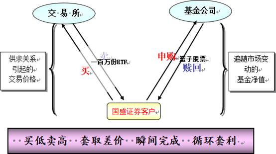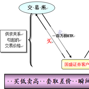 当ETF市值小于其净值的时候,投资者就可以买入“一篮子股票”(成本是“净值”乘以100万),然后申购,最后卖出ETF(收益是“市值”乘以100万),赚取ETF溢价部分的利润——溢价套利;同样,ETF市值大于其净值,投资者就可以买入100万份ETF(成本是“市值”乘以100万),然后赎回得到“一篮子股票”,最后卖出成份股(收益是“净值”乘以100万),赚取ETF折价部分的利润——折价套利。