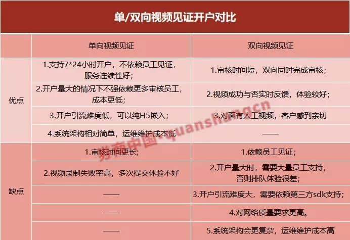 实际上,单向视频见证开户和双向视频见证开户这两种模式各有优势。北方一家拥有单向视频见证资格的券商互金业务相关负责人总结对比了以下几点: