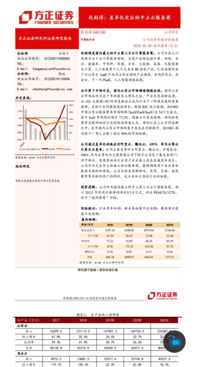 投资逻辑:公司作为国内最大的中立第三方云计算服务商,预计20/21年实现归母净利润0.5/1.0亿元,对应PE667X/337X。给予“强烈推荐”评级。