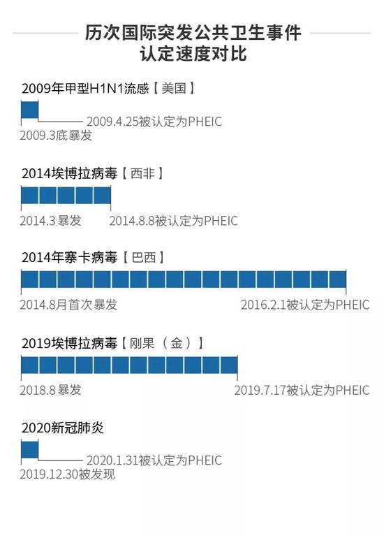 仅仅一个月的时间,新冠肺炎就上升为国际公共卫生紧急事件(PHEIC),这反映了病毒暴发的高速度。与其他几次PHEIC相比,此次肺炎疫情被确认的速度与2009年甲型H1N1流感暴发时期比较相近,都在1个月左右。
