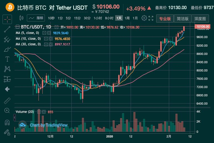 2月9日,多平台比特币价格报价突破10000美元关口,为去年10月26日以来首次。此次上涨行情已延续近一个月时间。1月3日,比特币价格回落至6875.93美元低点,随后打开上行通道,快速突破7000美元、8000美元两大关口。1月27日,价格突破9000美金后上涨加速,在9500美元及9800美元附近短暂徘徊后,2月9日上午11:00左右突破10000美元大关。截至发稿时报价10105美元,较12月底涨幅高达45%以上。