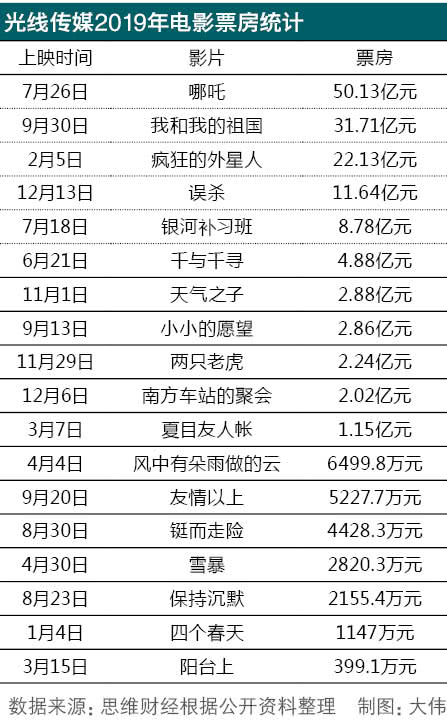 《投资者网》统计光线传媒2019年上映的18部影片发现,票房超过10亿元的仅有4部,票房不足1亿元的多达7部。