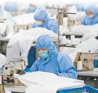 2月8日,江苏红豆集团工作人员在一般性防护服生产线上作业。