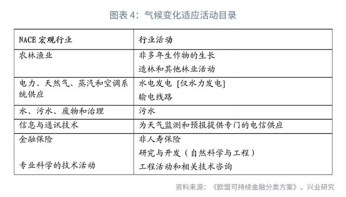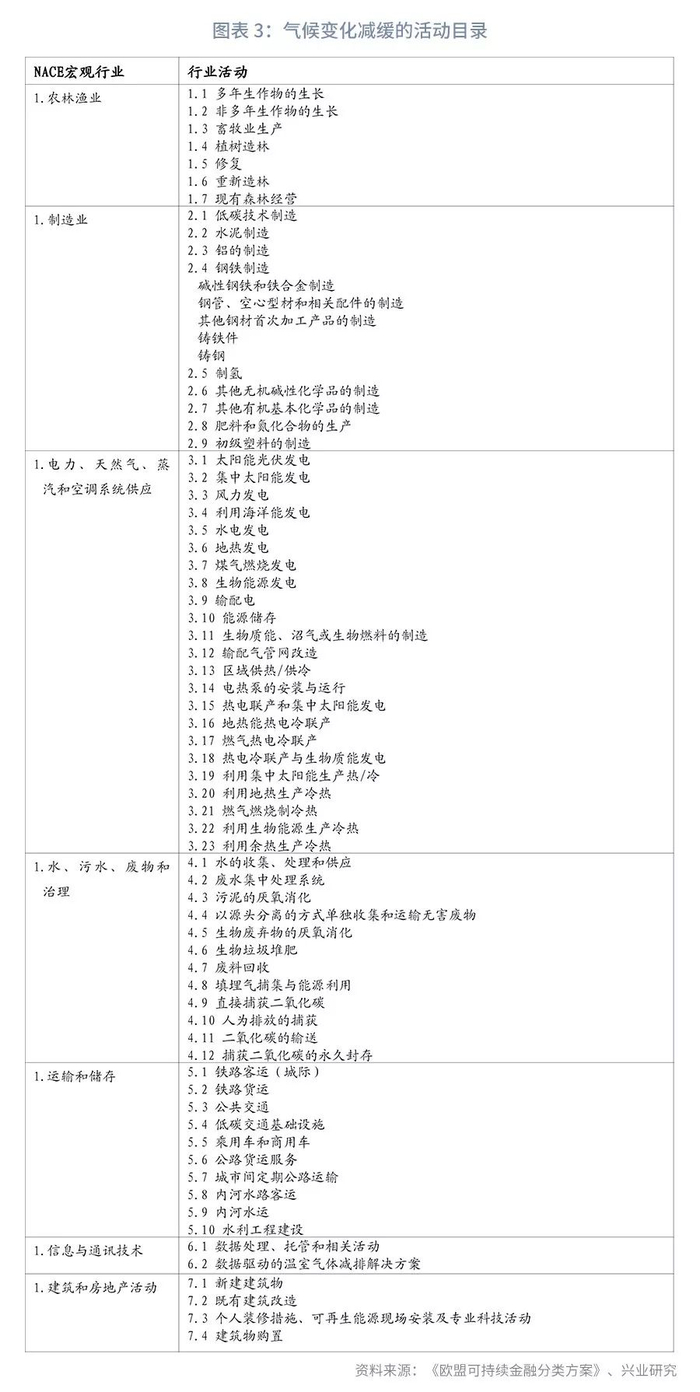 《分类方案》以欧洲行业标准分类系统NACE为框架,类似于我国的国标行业分类,在NACE系统内的经济活动中识别出哪些具备环境可持续性,涉及到NACE的二级子目录、三级子目录和四级子目录,清晰标明了行业活动代码,并对NACE系统包含的经济活动还进行了一些补充,并计划在未来将更多的活动纳入,持续动态调整。