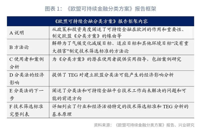 《分类方案》是《可持续发展融资行动计划》的主要组成部分。《可持续发展融资行动计划》(以下简称《行动计划》)可以称作是欧盟的可持续金融发展战略,旨在建立可持续金融综合体系,从而实现欧盟的可持续发展与应对气候变化的目标。该行动计划主要包括三大领域、10大行动要点,其中,列在第一位的行动要点即为可持续性的经济活动建立一个欧盟分类体系,分类哪些活动可被认为是“可持续性的”,即明确具有环境可持续性的经济活动类型,为政策制定者、行业和投资者提供实用性工具,使投资者和银行等更容易识别可持续金融市场投资机会。经过一年多的工作,2019年6月,欧盟委员会技术专家组(TEG)发布了《欧盟可持续金融分类方案》(EU Taxonomy),该分类方案是《欧盟可持续发展融资行动计划》的重要组成部分,将会成为欧洲金融领域新监管框架的制定基准,对该分类方案欧盟还在持续公开咨询和修正。