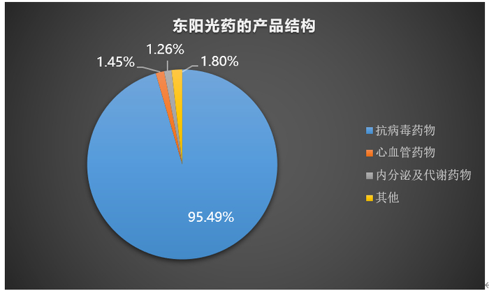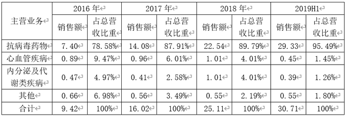 从上图我们可以看到,最近几年,东阳光药的抗病毒药物占总营收的比重在不断加大,其他产品的销售占比仍然较小。截止2019年6月30日,抗病毒药物占总营收的比重为95.49%,心血管药物占比1.45%,内分泌及代谢药物占比1.26%。