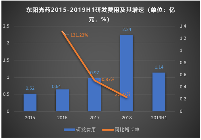为此,东阳光药进行了“内生性增长+外延式扩张”的经营模式。自2015年上市以来,公司投入了大量的研发资金。2018年投入了2.4亿元的研发费用,占总营收比例为8.93%,同比增长131.24%,截止2019年上半年公司投入了1.14亿元。