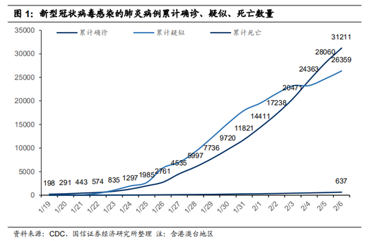 确诊患者数量超过 3 万,严防死守下疫情拐点将临近。截止 2020 年 2 月 6 日24 时,全国(含港澳台)确诊病例 31211 例,现有疑似病例 26359 例,死亡637 例。新型冠状病毒感染的病情隐匿性强,相当多病人没有高烧,初期症状不明显,并且潜伏期就具有传染性,造成比较严峻的防疫形式。在国家层面已经采取了强力的措施,民众的隔离、防疫意识显著增强的情况下,目前已连续两日出现新增确诊病例下降,预计疫情情况将逐渐好转。