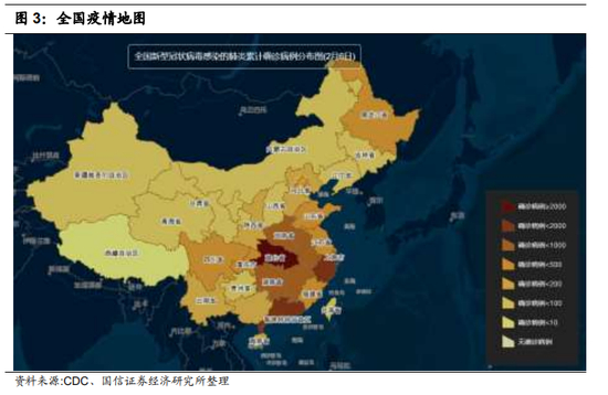 疫情起源地湖北省为重灾区,邻近省份确诊病例较多。截止 2 月 6 日 24 时,湖北省累计确诊病例数量 22112 例,现有疑似病例 21261 例,死 6184 例,临近省份除陕西外确诊数量均已超过 500 例。相比于 2003 年“非典”时期,高铁、飞机等交通方式的普及在提高了交通便利程度的同时,也助长了导致疾病更快扩散,影响范围更广。此外,病毒爆发初期正值“春运”的人口流动频繁时期,也助长了疾病在不同地区间的传播。