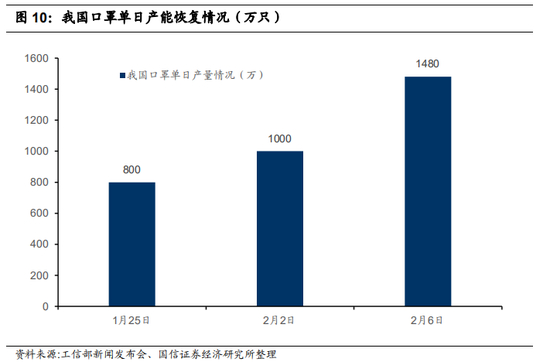 生产企业加快复工,全力投产,产能利用率持续恢复。疫情发生后各口罩生产企业迅速反应,迅速组织员工复工,加班加点生产,尽快恢复产能,根据工信部数据,1 月 25 日大年初一已有 30 多家企业复产,单日产量达到 800 万只以 上。根据发改委公布数据,2 月 6 日我国口罩产能已恢复近 70%,日产量达到1480 只。预计将很快恢复到 2000 只左右的满产水平。
