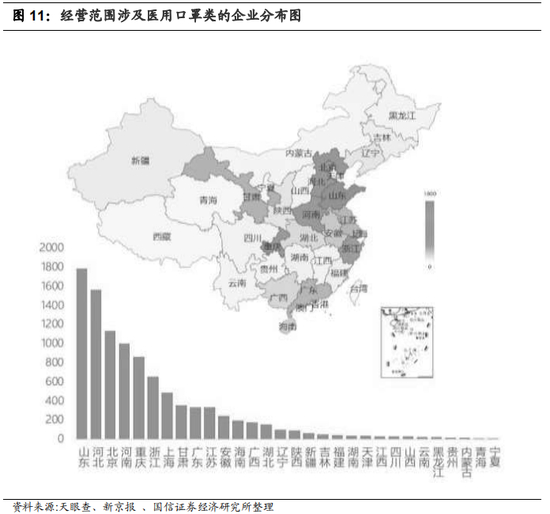 医用口罩产业链相关企业占比不足 50%。在 21000 家口罩产业链相关企业中,经营范围涉及医用口罩及上下游的企业约 9700 家。从地区分布来看,山东、河北、北京、河南、重庆等省市涉及医用口罩生产的企业占全国的 64%,数量最多的山东省有近 1800 家相关企业。