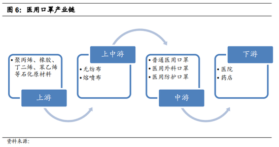 医用口罩产业链下游为医院、药店等终端客户。生产厂商生产好的医用口罩通过医药商业企业、物流公司配送到医院、药店等终端,最终用于院内防护或零售。