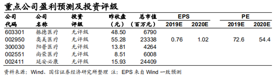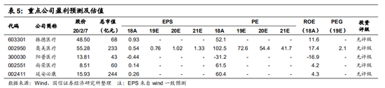 毛利率集中在 25~40%之间,ROE 差异较大。可比公司财务对比来看,盈利能力差异较大,主营产品以医用敷料为主的振德医疗和奥美医疗较为接近,毛利率在 30%左右,净利率在 10%左右。阳普医疗主要产品为真空采血系统,毛利率与销售费用率、研发费用率均相对较高。延安必康商业占比较高,毛利率相对较低。ROE 水平差异较大,振德医疗与奥美医疗较高,主要受益于资产周转率较高和 EBIT Margin 较高。