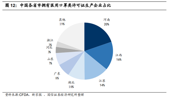 具备医用口罩生产许可证的企业不足 400 家。根据国家药监局数据,国内医用口罩许可证数量约 560 个,具备生产许可证企业约 350 家。以河南、江西、江苏、湖北和广东居多,其中河南省最多,有 68 家企业,拥有 138 张许可证。综合看来,尽管口罩产业链相关企业众多,但具备生产医用口罩资质的企业占比较少。