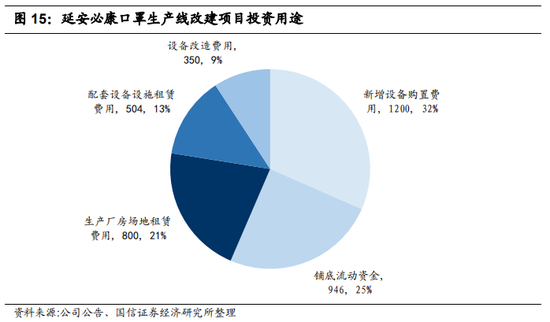 口罩生产线改建项目主要支出为新增设备购置费 1200 万元。预计口罩生产线改建项目总投资 3,800 万元,其中生产厂房场地租赁一年费用 800 万元,配套设备设施租赁一年费用 504 万元,设备改造费用 350 万元,新增设备购置费用1,200 万元,铺底流动资金 946 元。