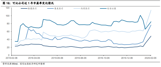 口罩行业相关公司自疫情爆发后估值水平均大幅提升。对比可比公司过去一年的市盈率变化情况(周收盘价,TTM,前复权),振德医疗、奥美医疗、尚荣医疗 2 月 7 日收盘价相比于 1 月 17 日均出现显著提升,且已经大幅高于过去一年内的平均市盈率水平。(阳普医疗由于市盈率为负未列出)。延安必康受公告建设口罩生产线影响,同期市盈率也有较大提升,但与过去一年相比仍处于接近水平。