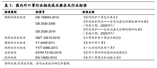 目前国内主要的口罩技术要求共有五种:《YY0469-2011:医用外科口罩》、《GB19083:医用防护口罩技术要求》、《GB 2626-2006:呼吸防护用品——自吸过滤式防颗粒物呼吸器》、《YY/T 0969-2013:一次性使用医用口罩》、《GB/T32610-2016:日常防护型口罩技术规范》。美国和欧盟的主流标准分别为《ASTMF2100-2019 医用口罩用材料性能的标准规范》、《EN14683-2014 医用口罩要求和试验方法》。