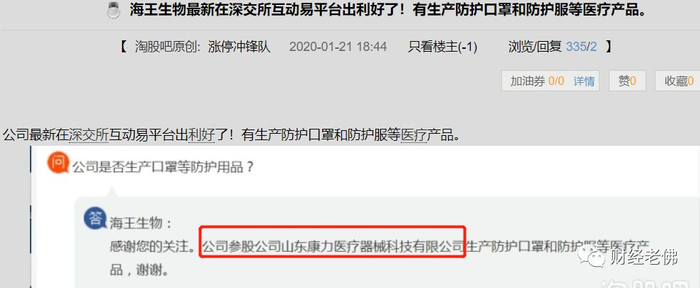 海王生物自1月20日开始启动连续多天封板,这与同时间段其在深交所互动易平台出现的利好消息不无关系。公司在互动平台公开答复,参股公司山东康力医疗器械科技有限公司有生产防护口罩和防护服等医疗产品,无疑这一答复成了推动股价持续大涨的催化剂。