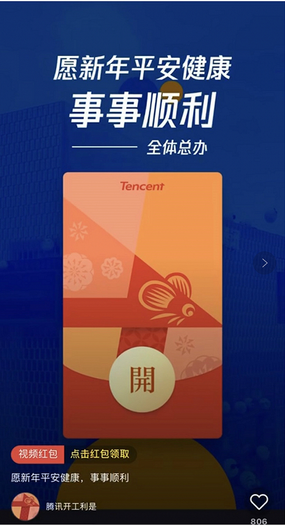 今年,腾讯制作了专属的微视视频红包,员工可以通过微信和QQ领取。在红包内容里,腾讯感谢了在春节疫情期间坚守在岗位的团队、为抗击疫情提早回岗的团队以及自愿加入的志愿者员工,同时提醒所有员工在疫情期间注意安全。