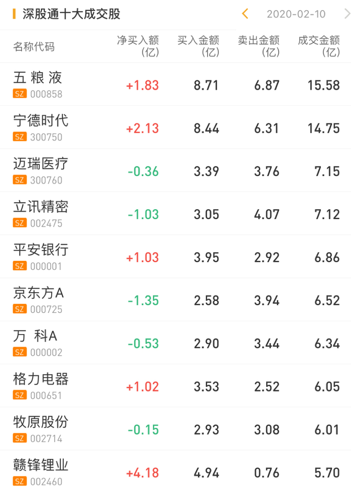 深股通净买入五粮液1.83亿元,净买入宁德时代2.13亿元,净买入赣锋锂业4.18亿元。