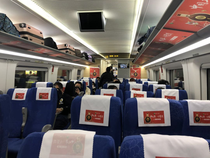 在等了近两个小时后,记者登上前往上海虹桥火车站的高铁。车上乘客并不是很多,有很多空位。乘客们都戴着口罩,安静地休息,没有任何吵闹的声音。沿途,高铁上的工作人员也不再像往常一样推着小车,叫卖“瓜子饮料矿泉水”了。