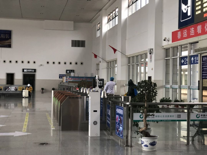 与家人道别后,记者拖着行李箱进入火车站,准备接受安检。与往常不同的是,记者在接受安检之前还要进行登记,填写了往返地点、个人健康状况、有无接触武汉人员等信息。