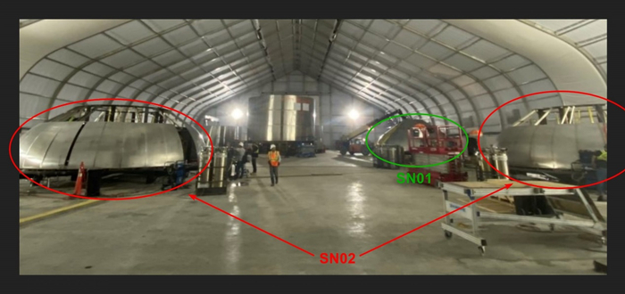 在帐篷后部,几个星际飞船SN01储罐环的制造工作也在进行中。在中部,技术人员正在装备星际飞船SN01的发动机和“裙部”,那里的最底部储罐圆顶将连接三个(最多六个)猛禽发动机。在左侧,一堆由两个环组成的环段似乎被存放在一边,在马斯克的照片中只模糊可见,另一对环段正在转台的帮助下被焊接起来。