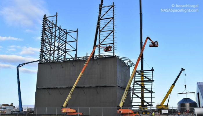 在马斯克最新照片中显示的“弹簧结构”(即帐篷)之外,SpaceX承包商似乎只有几天的时间就能完成第二个相同帐篷的外壳,最终将可用于封闭制造作业的空间增加一倍。与此同时,随着星际飞船的硬件和生产设施迅速结合起来,SpaceX还在建造被认为是组装大楼的建筑。这是个十分庞大的结构,在工人将垂直星际飞船和超重型助推器组装成成品火箭的同时,它将保护它们不受其他元素的影响。