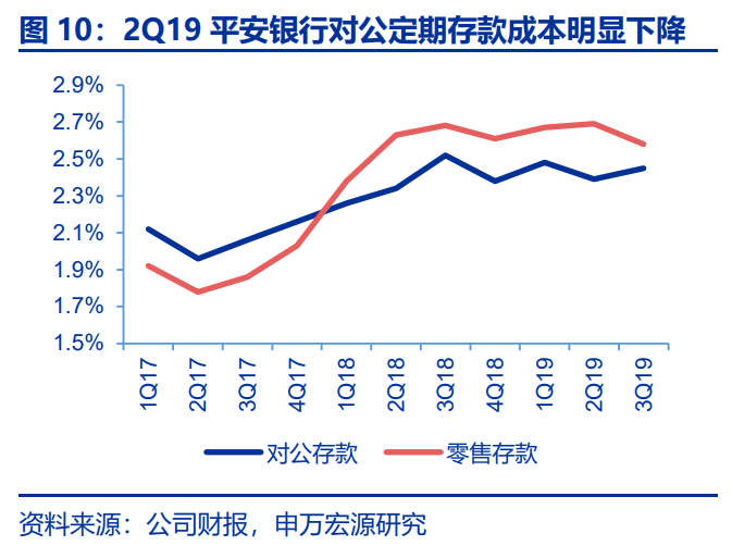 在新对公业务模式下,平安银行获取的最大益处在于用集团的表做自己的客户,快速夯实存款基础。在轻资本化的对公业务服务模式下,2019年平安银行存款增长明显起色,全年新增存款3084亿,其中对公存款占比60%达1863亿,而2017、2018年全年存款增长仅786和1281亿,新增对公存款占比仅为8%和6%。价格方面,1Q-3Q19平安银行平均对公存款成本为2.44%,低于平均零售存款成本21bps。平安银行存款问题在新对公模式下得到明显改善。