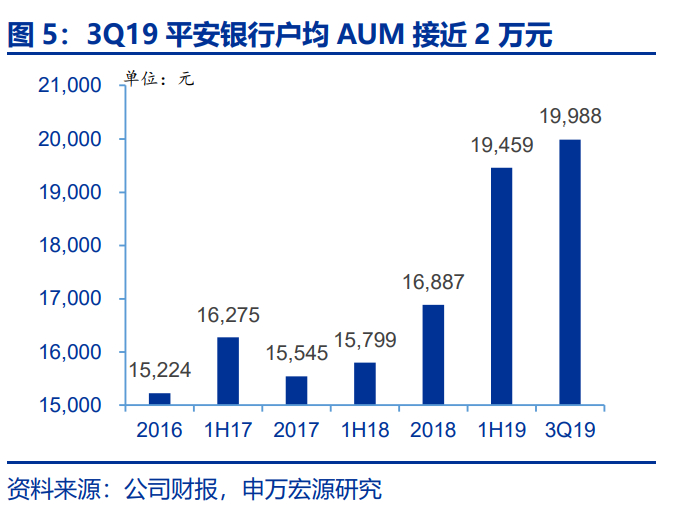 客户经营方面,集全集团之力,平安银行客均贡献稳步提升。1)消费金融方面,平安集团强大的代理人团队是平安银行拓展消费金融产品的重要渠道(MGM模式)。2019年前三季度,MGM模式发放新一贷、汽融贷款分别为477亿元和395亿元,占整体发放比例分别为58%和37%;发卡370万张,占新增发卡量的34%。这是平安银行零售转型第一阶段以LUM为切入点的重要业务模式,不与LPR挂钩且利率较高的特点构筑了其高于同业的零售条线存贷利差;2)财富管理方面,私行财富是平安银行零售转型第二阶段的重中之重。集团将银行定位为集团财富管理业务的核心组织。根据管理层在开放日上的介绍:“2018年,平安银行定位为平安集团高净值客户的主要经营阵地。在集团的支持下,已经完成吸收合并平安信托旗下1200人财富管理团队。”、“平安银行理财子公司将作为平安集团一级子公司”。在集团的高定位、子公司队伍整合、MGM模式的组合下,平安银行财富管理实力大幅提升,截至2Q19户均AUM较2016年底增长28%达到19459元,进一步沉淀出零售存款带动户均零售存款较2016年底增长23%达到5715元。随着挖掘客户的复合需求,沉淀AUM和零售存款,平安银行的客户经营实力有望进一步抬升。