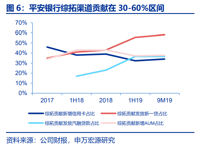 客户获取方面,平安银行凭借集团优势既快又好地批量获客。截至3Q19,平安银行零售客户数达到9366万户、App用户数达到8123万户,较2016年底分别增长79%和211%,其中每年新增由集团综拓渠道贡献的零售客户占比稳定在30-40%的水平。更重要的是,综拓渠道贡献的零售客户质量优异。一方面,资产质量好于其他渠道,2Q19,平安银行新一贷、汽车金融和信用卡三大零售尖兵产品的综拓渠道客户的不良率分别为0.53%、0.54%、1.16%,分别低于整体0.60、0.08和0.21个百分点。另一方面,集团客户财富实力更强,截止2Q19,平安集团中产 以上客户占比72%,因此平安银行转型以来客户数提升的同时,私行客户占比亦从2016年的0.032%提升至0.043%。目前平安集团拥有1.96亿客户,银行在客户体量上仍有一定差距,我们认为在未来平安银行逐渐将客户规模扩充至与集团相当的水平是值得期待的。