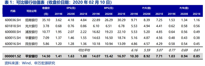重申平安银行首推组合,目标价1.5X 20年PB。我们选取了其他5家上市股份行作为可比公司,运用PB估值法进行估值。根据2020年2月10日收盘价,目前5家可比股份行2019-2021年的平均PB分别为0.77、0.69、0.61。与上市股份行平均水平相比,平安银行估值水平已经有一定溢价,但我们认为平安银行的独特优势必将赋予公司更高的估值溢价,并向优秀的零售银行招行看齐,招行2017年至今静态PB均值为1.54X。平安银行的优势在于:(1)平安银行2019年存量不良出清,核心盈利能力保持强劲;(2)战略上,零售战略稳步推进,客户基础能力明显提升,同时形成集团联动的对公服务新模式,存款基础薄弱的短板迅速解决,未来整体负债成本有望进一步下降,资产端降低一定风险偏好,形成零售银行高息差、低风险的良性循环,更为其零售负债逐步做精做强创造充分的时间;(3)具备同业没有的强大集团优势:平安集团在客户、综合金融和管理制度上为平安银行零售转型保驾护航。当前股价对应20年0.94X PB,维持目标价1.5X 20年PB,上行空间60%。