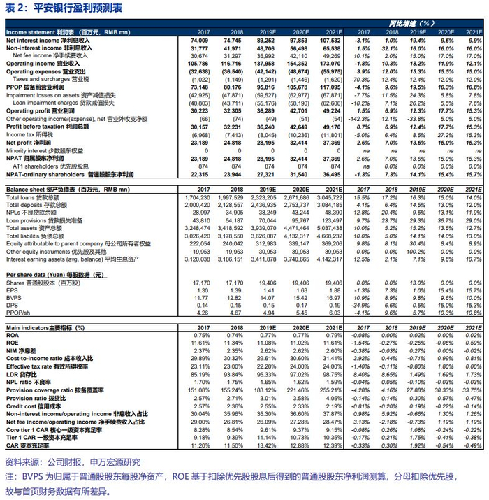 预计2019-2021年归母净利润增速分别为13.6%、15.0%和15.3%(维持盈利预测),核心假设:(1)对公新业务模式下平安有望快速夯实存款基础,负债端成本下降净息差有望企稳。预计2019-2021年息差分别为2.62%、2.62%、2.60%。(2)平安银行存量不良出清,资产质量继续改善。预计2019-2021年不良率为1.65%、1.62%、1.59%。(3)资产规模稳步扩张。预计2019-2021年总资产规模同比增速为15.2%、13.5%、12.7%。(4)理财子公司开业后,中收保持稳步增长。预计2019-2021年手续费净收入同比增速为15.0%、17.0%、17.0%。、